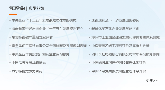 中咨公司專家具有豐富理論知識和實踐經驗,通過進行實地調查研究,應用科學方法,提出企業發展戰略和經營管理改進方案。主要為企業提供企業發展戰略、企業信息化、財務管理、人力資源管理、企業診斷等服務,為企業發展保駕護航。